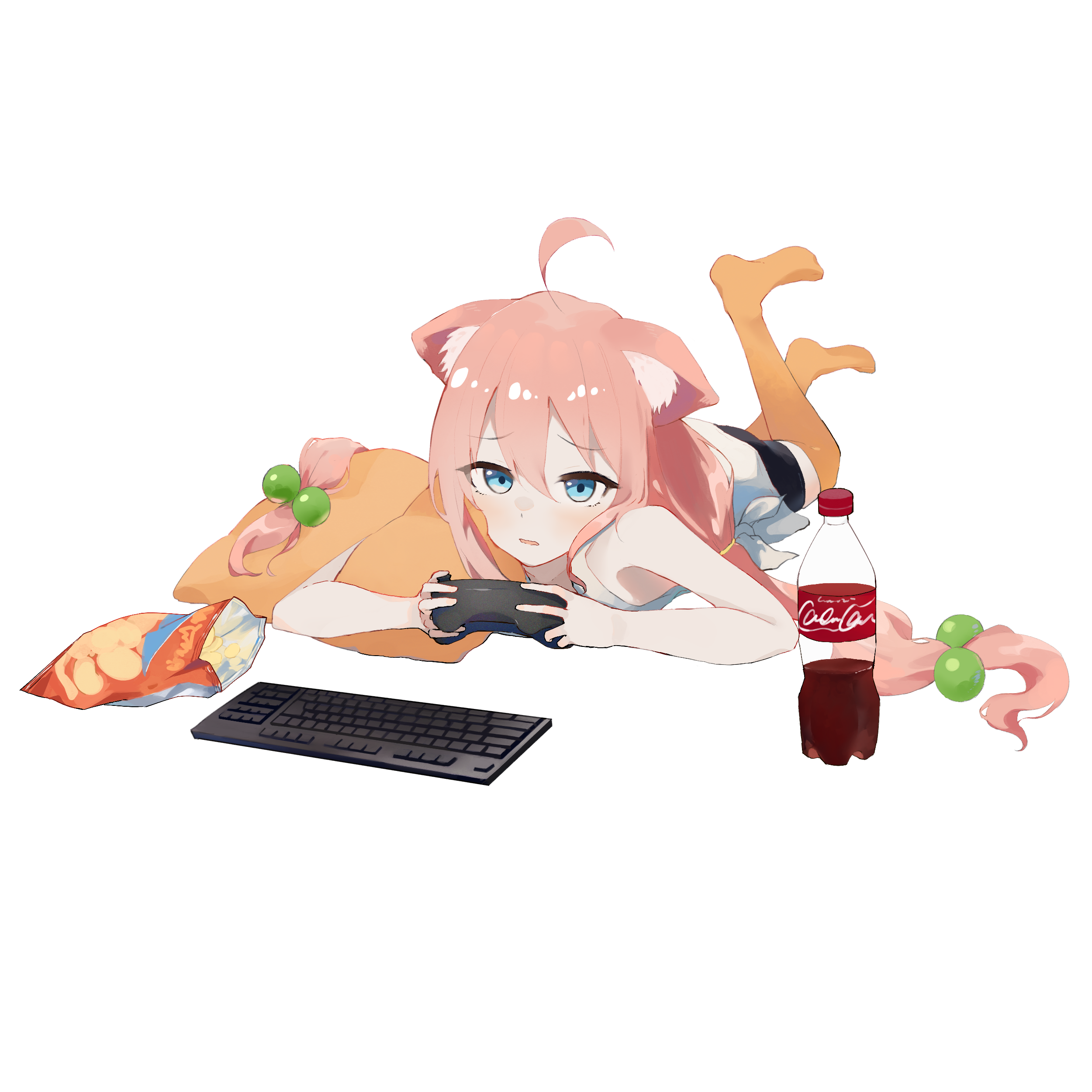 1girl absurdres ahoge animal_ear_fluff animal_ears bare_arms bare_shoulders black_shorts blue_eyes bottle cat_ears chips_(food) coca-cola commentary_request computer_keyboard controller dot_nose double-parted_bangs feet_up food furrowed_brow game_controller hair_between_eyes hair_over_shoulder highres hinata_channel holding holding_controller holding_game_controller kurobeko_(kur0bek0) light_blush long_hair low_twintails lying nekomiya_hinata on_stomach orange_thighhighs parted_lips pillow pink_hair potato_chips raised_eyebrows shirt shorts side-tie_shirt sidelocks simple_background sleeveless sleeveless_shirt soda_bottle solo the_pose thick_eyelashes thighhighs twintails v-shaped_eyebrows very_long_hair virtual_youtuber white_background white_shirt