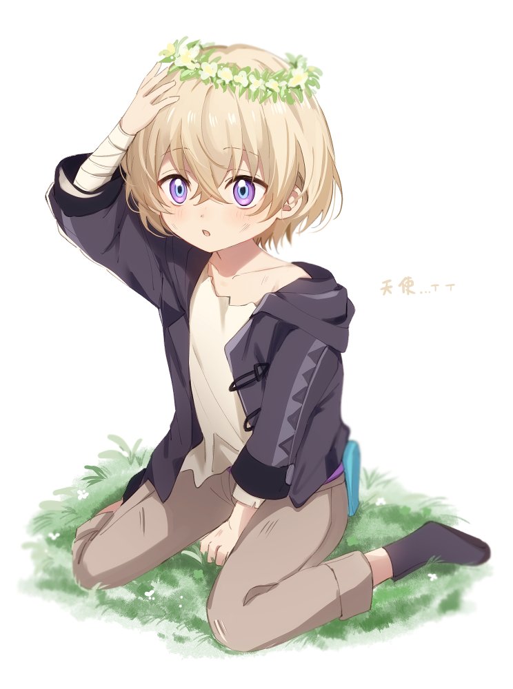 1boy :o aged_down arm_support arm_up aventurine_(honkai:_star_rail) bandaged_arm bandages black_hoodie black_socks blonde_hair blue_eyes blush brown_pants child commentary crossed_bangs flower flower_wreath grass hair_between_eyes hand_on_own_head head_wreath honkai:_star_rail honkai_(series) hood hood_down hoodie kakavasha_(honkai:_star_rail) long_sleeves male_focus multicolored_eyes off_shoulder open_clothes open_hoodie open_mouth pants purple_eyes sakuya_990331 shirt short_hair sidelocks simple_background sitting socks solo torn_clothes torn_shirt translation_request wariza white_background white_flower white_shirt