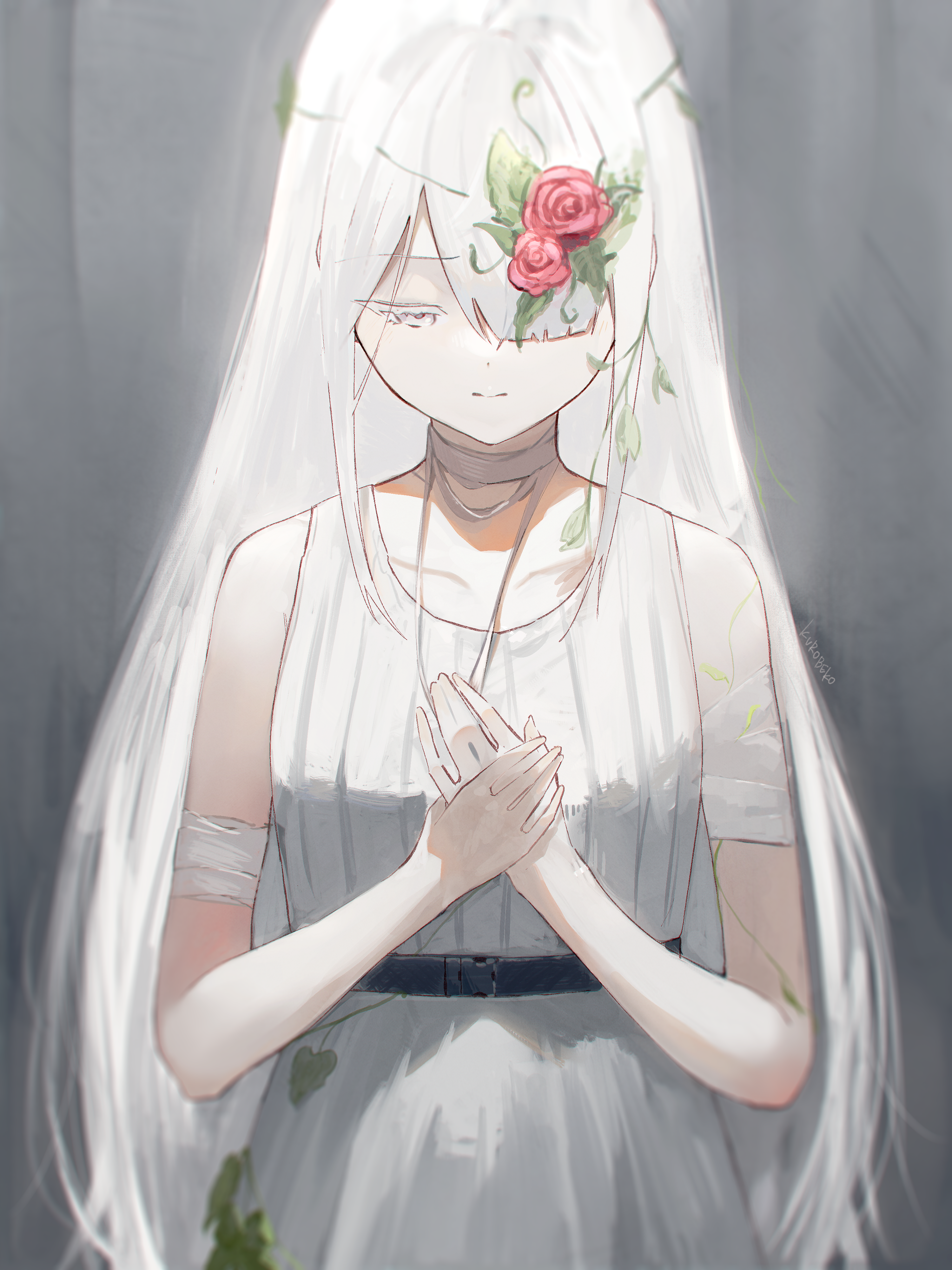 1girl absurdres artist_name bandaged_arm bandaged_neck bandages bare_shoulders belt black_belt breasts buckle check_flower closed_mouth collarbone colored_eyelashes commentary_request dot_nose dress flower flower_request grey_background grey_eyes hair_flower hair_ornament hair_over_one_eye hands_up highres kurobeko_(kur0bek0) light_blush light_frown long_hair looking_down loose_bandages medium_breasts original own_hands_together parted_bangs plant red_flower red_rose rose sidelocks sleeveless sleeveless_dress snap-fit_buckle solo upper_body very_long_hair vines white_dress white_hair