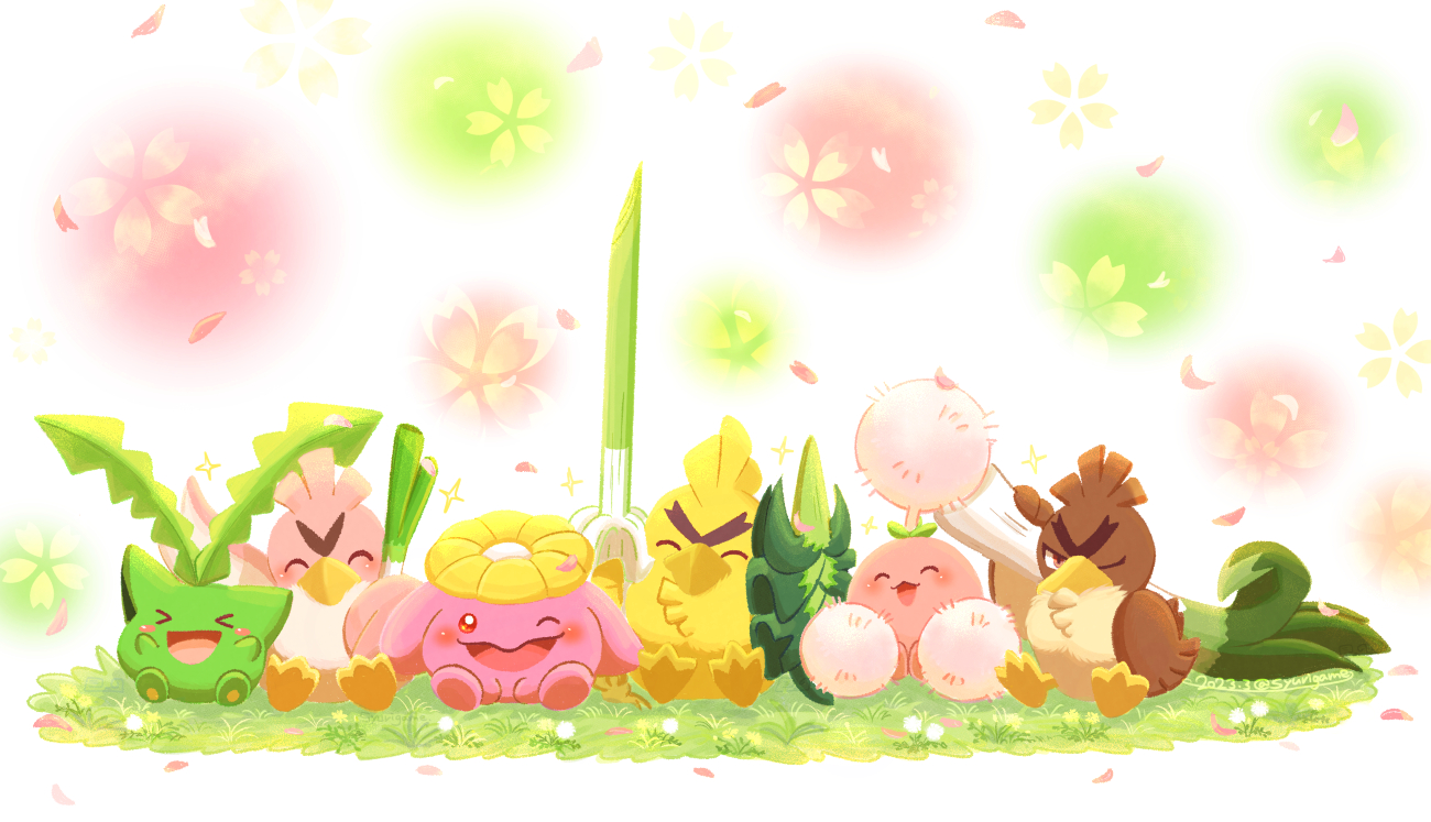 >_< :3 alternate_color bird bright_pupils brown_eyes closed_eyes dandelion duck falling_petals farfetch'd flower food galarian_farfetch'd galarian_form gen_1_pokemon gen_2_pokemon gen_8_pokemon grass holding holding_food holding_vegetable hoppip jumpluff nintendo no_humans on_ground one_eye_closed open_mouth petals pokemon pokemon_(creature) red_eyes shiny_pokemon shuri_(syurigame) sirfetch'd sitting skiploom vegetable white_pupils