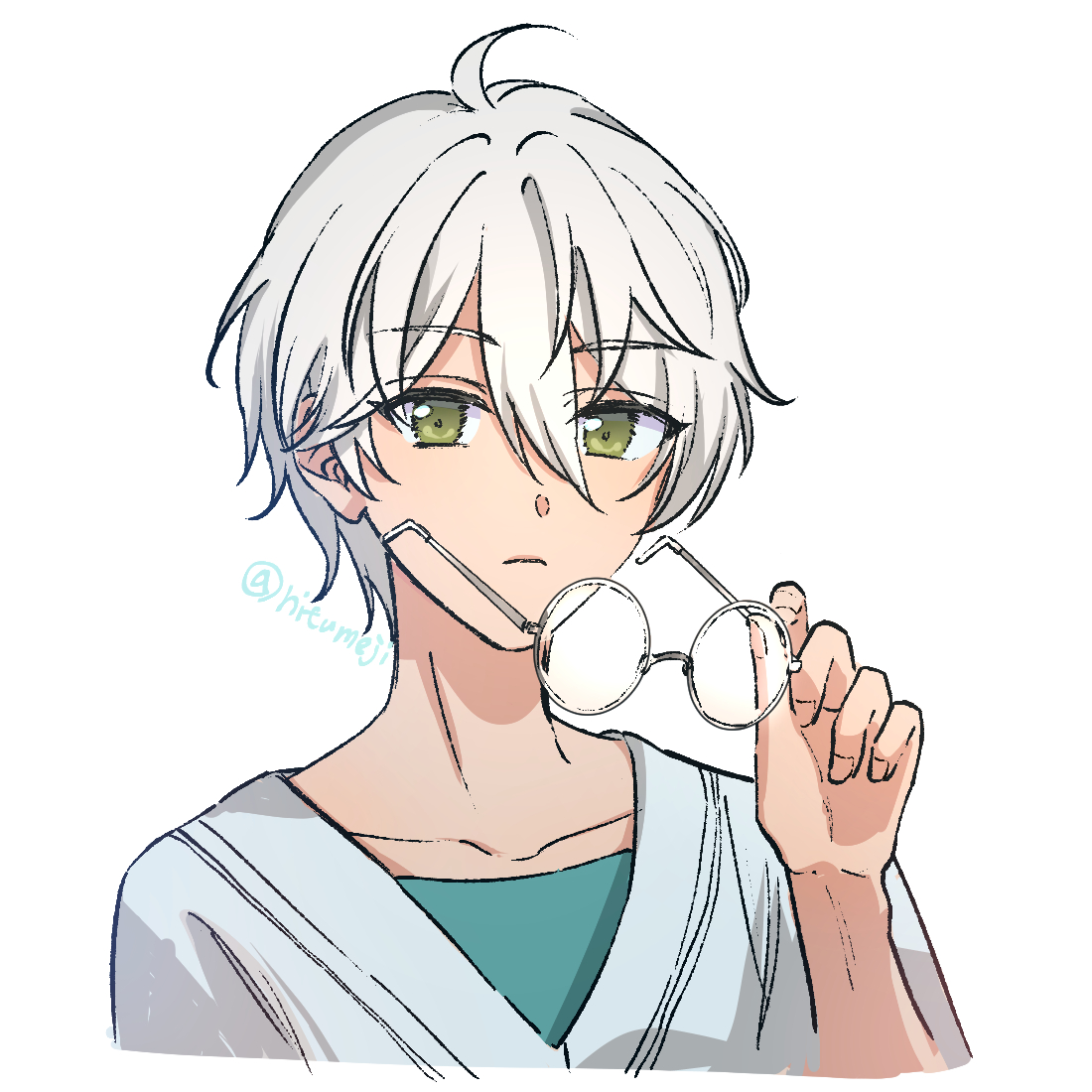 1boy closed_mouth ensemble_stars! glasses green_eyes grey_background hitumeji looking_at_viewer male_focus natsu_kanna pixiv_username removing_eyewear round_eyewear shirt short_hair simple_background solo twitter_username undershirt white_hair white_shirt