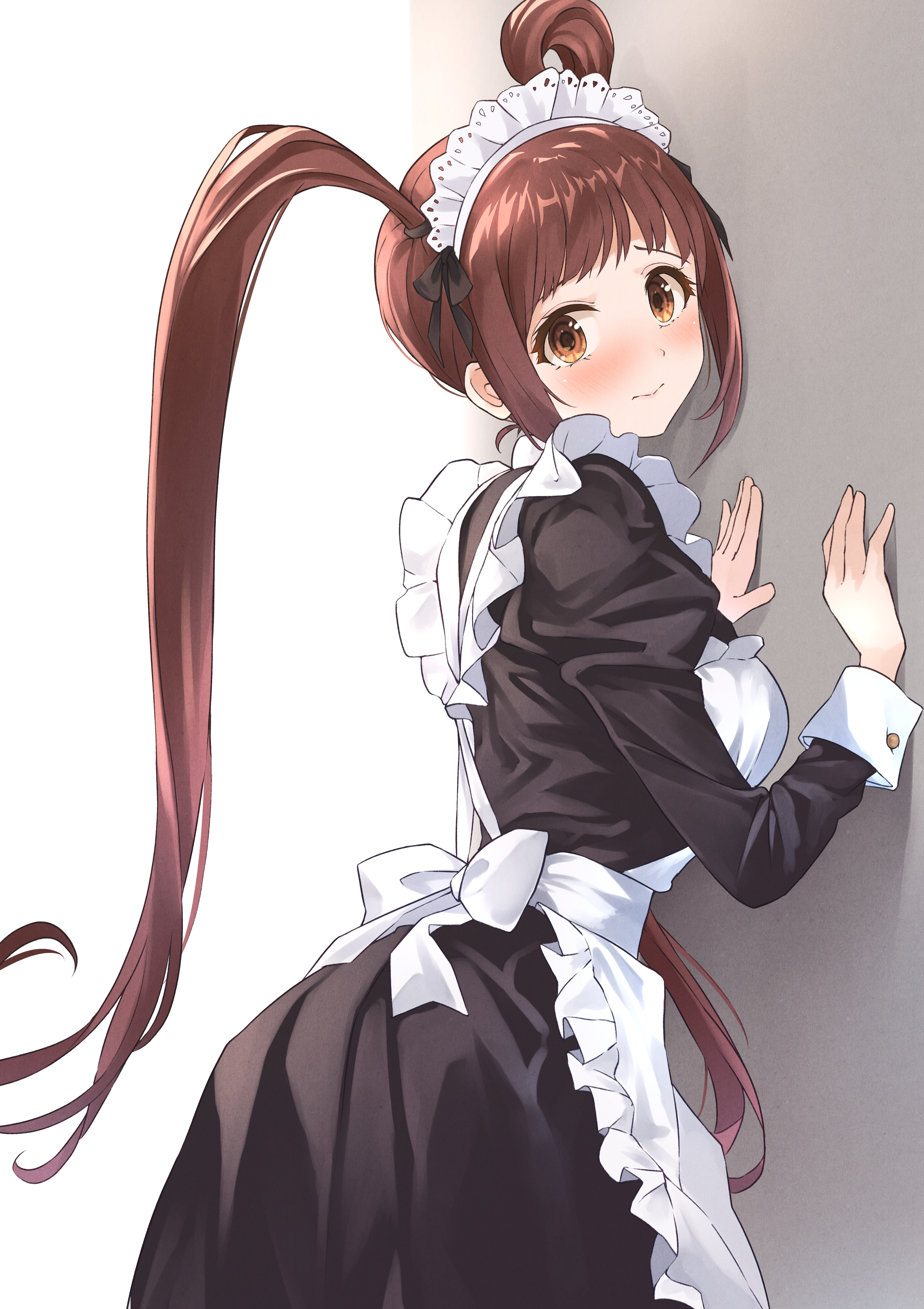 1girl absurdres against_wall alternate_costume apron b1ack_illust black_dress blush breasts brown_hair commentary_request dress enmaided highres idolmaster idolmaster_million_live! long_hair looking_at_viewer looking_back maid maid_apron maid_headdress matsuda_arisa medium_breasts solo twintails very_long_hair white_apron wrist_cuffs