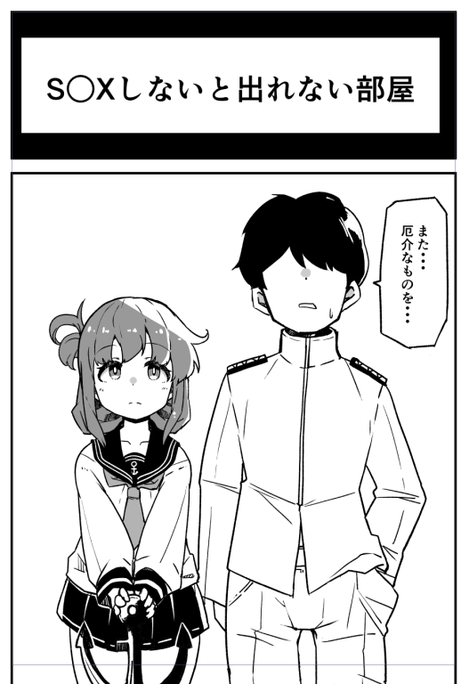 1boy 1girl admiral_(kancolle) anchor black_skirt commentary_request cowboy_shot faceless faceless_male folded_ponytail greyscale hand_in_pocket inazuma_(kancolle) kantai_collection kodachi_(kuroyuri_shoukougun) meme military_uniform monochrome naval_uniform neckerchief pleated_skirt room_you_can't_get_out_of_unless_you_x_(meme) sailor_collar sailor_shirt school_uniform serafuku shirt skirt translation_request