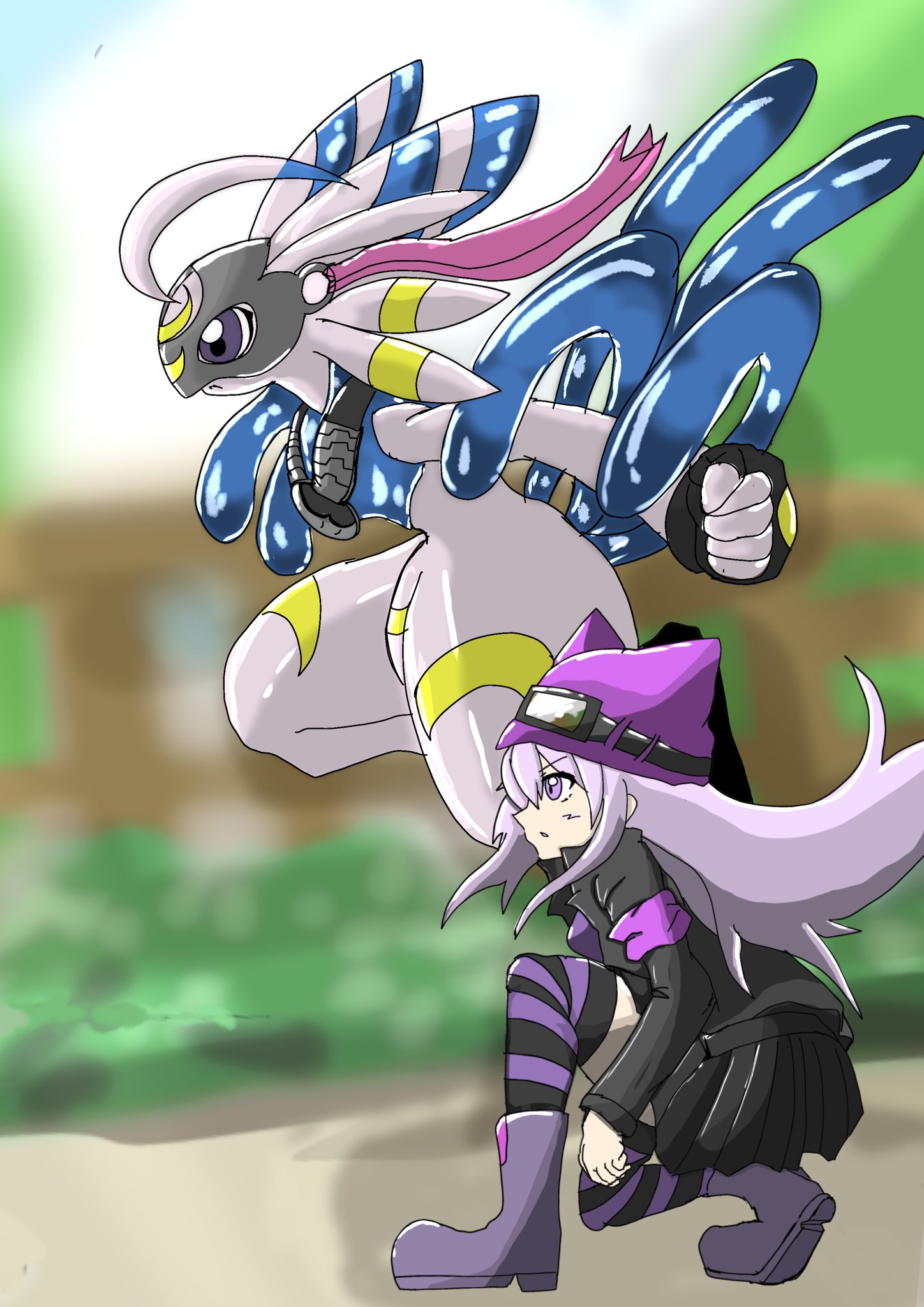 armor crescent_moon digimon digimon_(creature) furry furry_female goggles goggles_on_head hat highres lekismon long_hair moon purple_eyes purple_hair rabbit_girl sayo_(digimon)