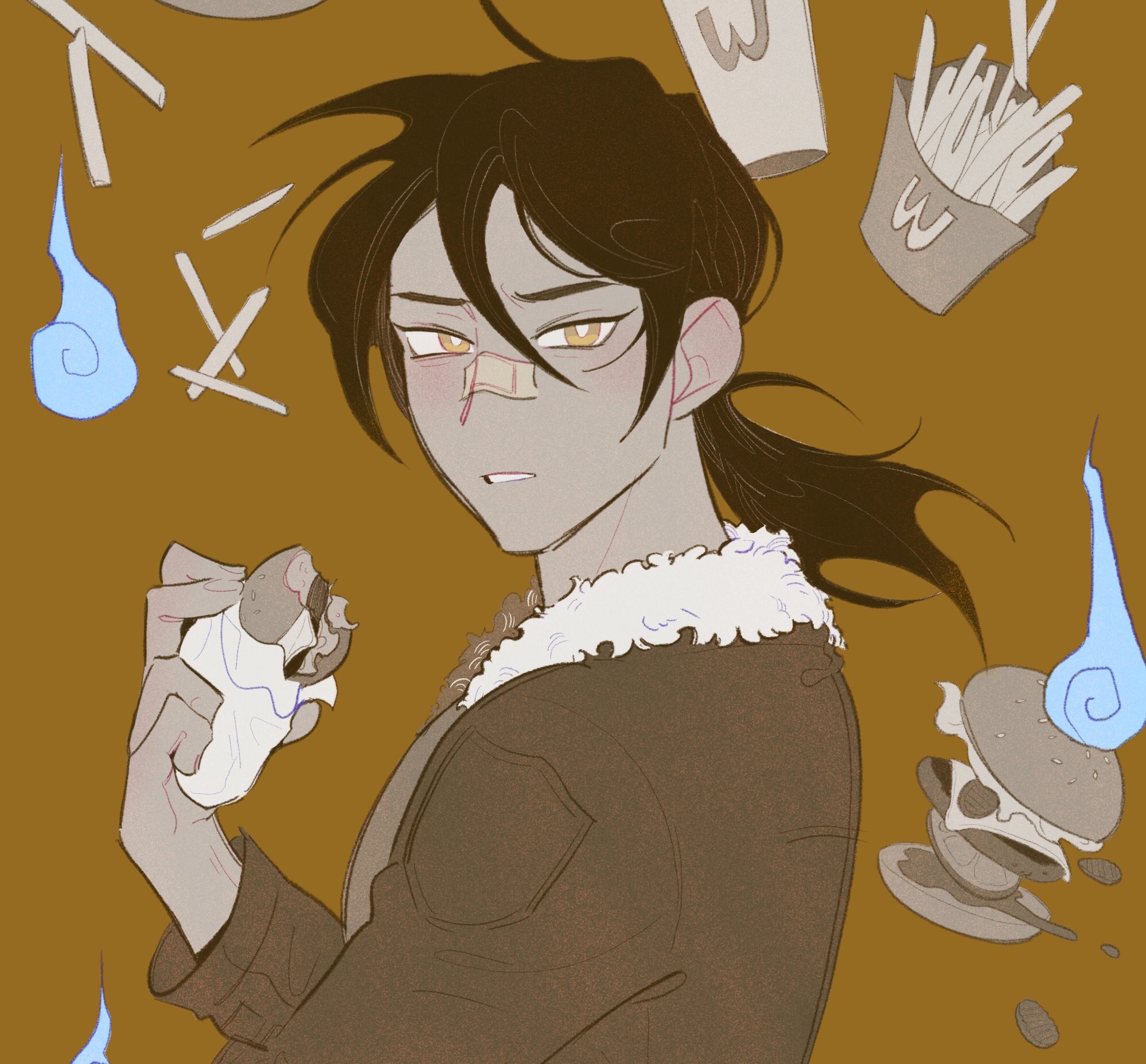 1boy bandaid bandaid_on_face bandaid_on_nose bright_pupils brown_background brown_hair burger commentary commission english_commentary food french_fries fur-trimmed_jacket fur_trim hand_up highres hitodama holding holding_burger holding_food jacket long_hair long_sleeves looking_at_viewer low_ponytail male_focus parted_lips ponytail robodumpling simple_background solo upper_body wcdonald's white_pupils yellow_eyes