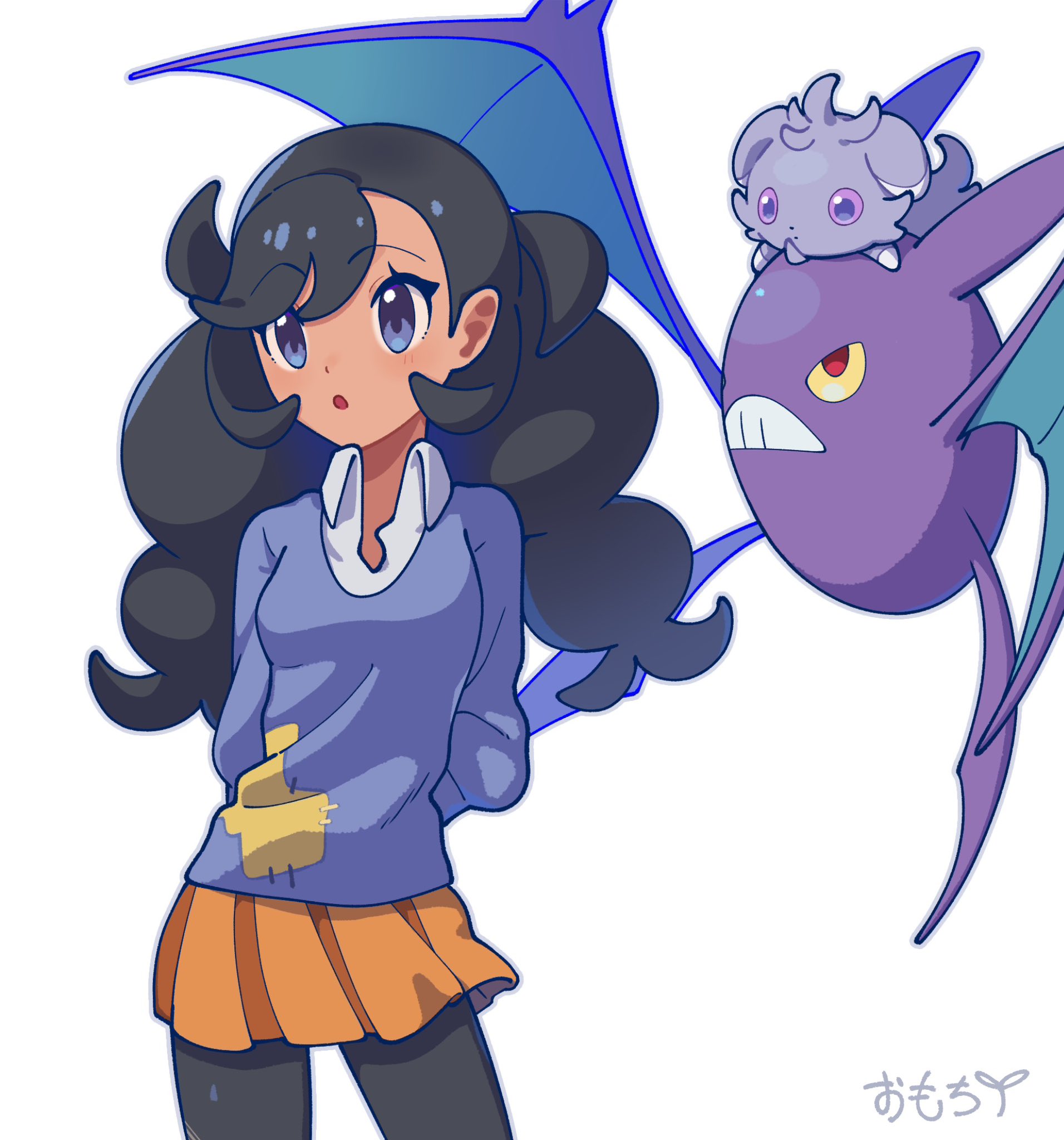 1girl :o arms_behind_back black_hair black_pantyhose crobat dark-skinned_female dark_skin emma_(pokemon) espurr gen_2_pokemon gen_6_pokemon highres long_hair long_sleeves nintendo omochi_(omotimotittona3) open_mouth orange_skirt pantyhose pokemon pokemon_(creature) pokemon_x_and_y purple_shirt shirt skirt white_background