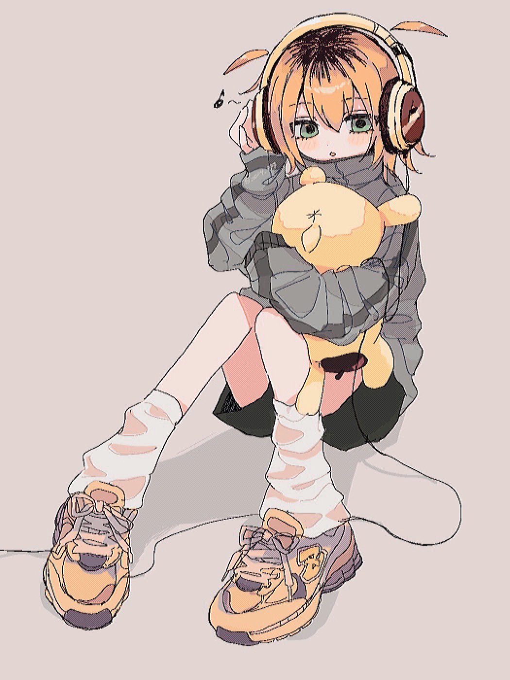 1girl full_body green_eyes grey_jacket hand_up headphones highres hugging_object jacket loose_socks nou4_777 orange_hair orange_shoes original parted_lips shadow shoes short_hair simple_background sneakers socks solo stuffed_animal stuffed_toy track_jacket white_socks wire