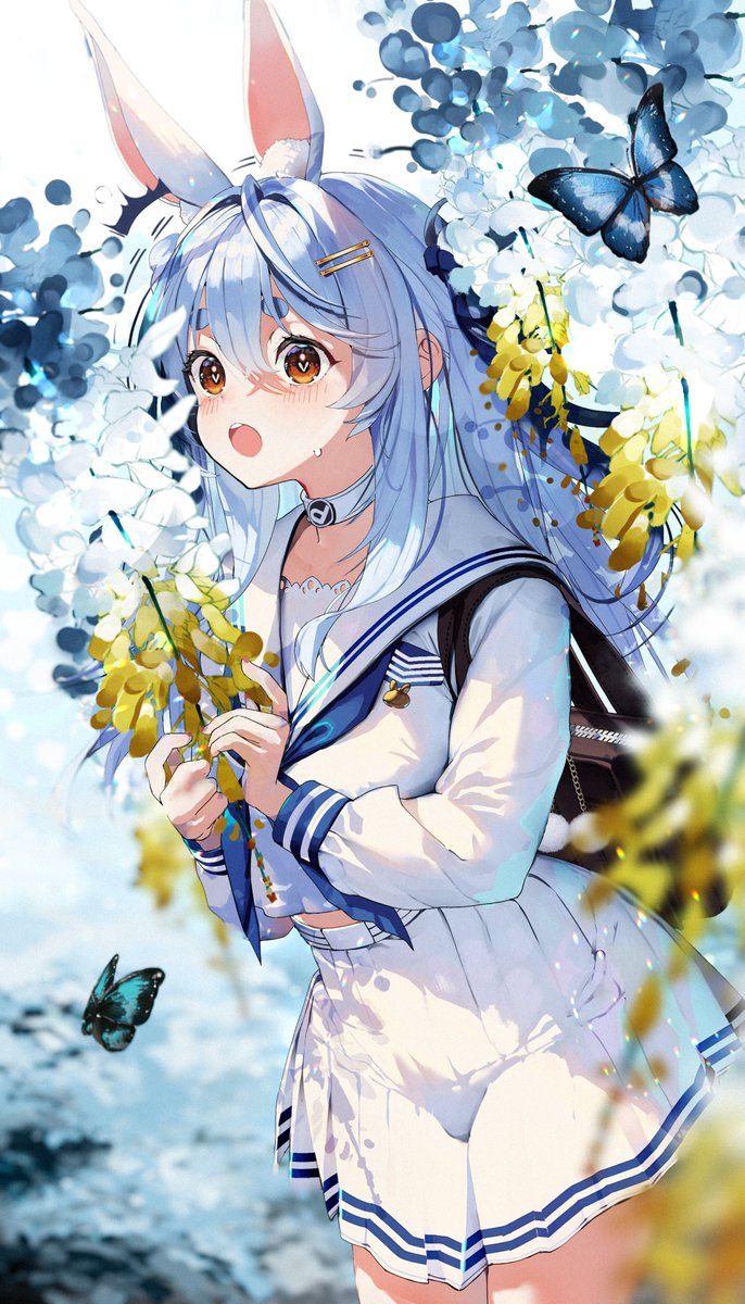 1girl animal_ears bag blue_butterfly blue_hair blue_neckerchief bug butterfly choker cowboy_shot cowlick flower hair_intakes hair_ornament hairpin haruhina_purple heart heart-shaped_pupils highres holding holding_flower hololive insect leaning_forward long_sleeves miniskirt neckerchief orange_eyes pleated_skirt rabbit_ears sailor_collar school_bag school_uniform serafuku shirt skirt sleeve_cuffs solo symbol-shaped_pupils usada_pekora virtual_youtuber white_choker white_flower white_sailor_collar white_serafuku white_shirt yellow_flower
