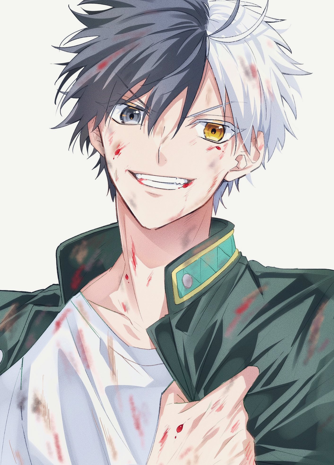 1boy black_hair blood blood_stain commentary grin heterochromia highres jacket looking_at_viewer male_focus multicolored_hair sakura_haruka_(wind_breaker) shirt short_hair smile solo split-color_hair swag_yo untranslatable_commentary teeth undershirt upper_body white_background white_hair white_shirt wind_breaker_(nii_satoru)