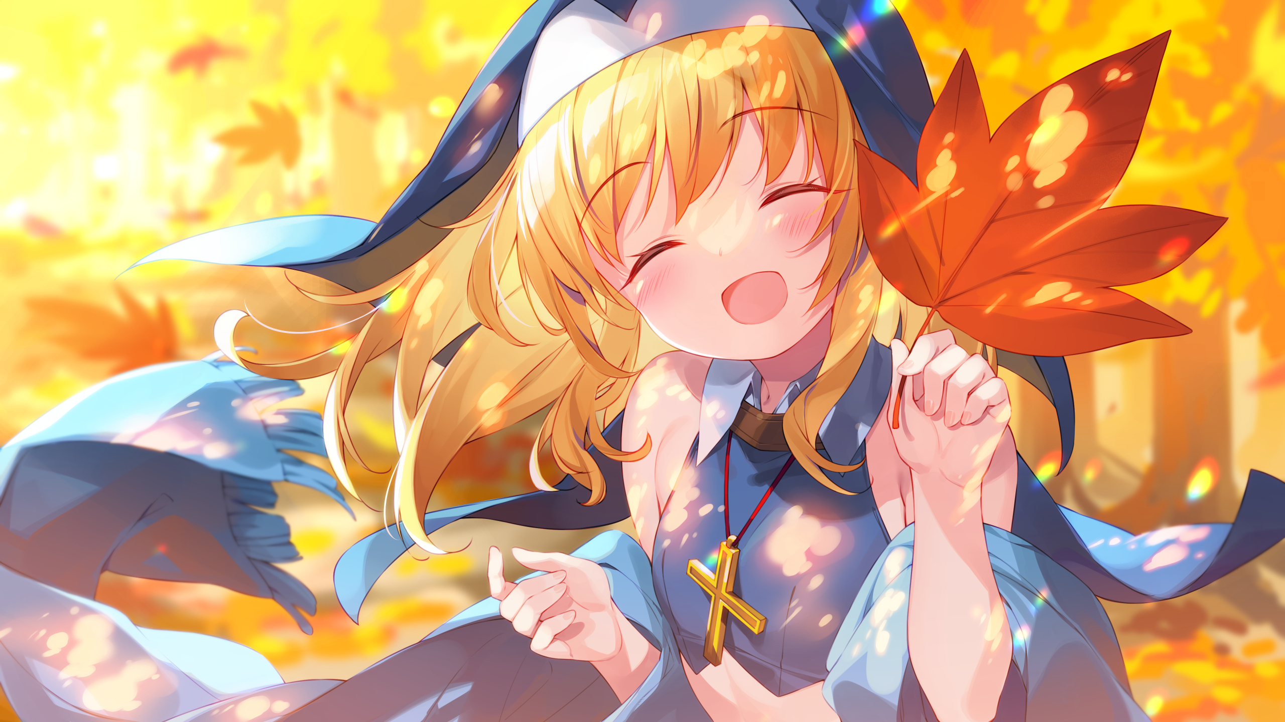 1girl ^_^ autumn_leaves bare_shoulders blonde_hair blue_scarf blue_shirt blurry blurry_background blush breasts bucchake_(asami) closed_eyes collared_shirt commentary_request cropped_shirt cross cross_necklace dappled_sunlight facing_viewer floating_hair habit head_tilt highres holding holding_leaf jewelry leaf long_hair midriff necklace nun_headdress ootomo_sourin_(sengoku_otome) open_mouth scarf sengoku_otome shirt sleeveless sleeveless_shirt small_breasts smile solo sunlight swept_bangs upper_body