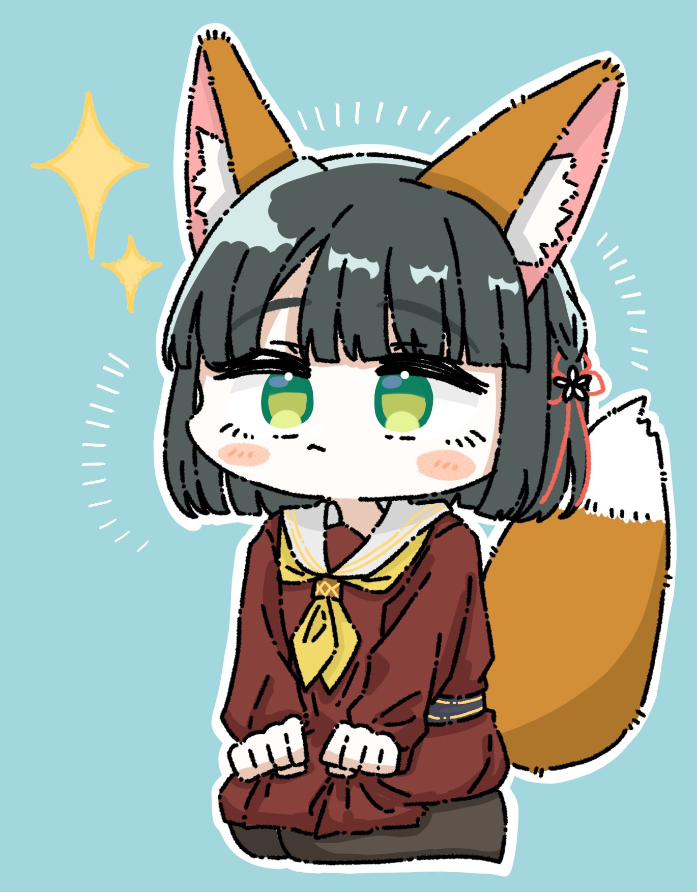 1girl :< animal_ears black_hair black_pantyhose blue_background blunt_bangs blunt_ends blush_stickers brown_dress closed_mouth commentary deformed dress emphasis_lines flower flower_knot fox_ears fox_girl fox_tail full_body green_eyes hair_flower hair_ornament hands_on_lap hasu_no_sora_school_uniform highres link!_like!_love_live! long_sleeves love_live! medium_dress momose_ginko neckerchief no_shoes outline pantyhose pleated_dress puripuri_hurai sailor_collar sailor_dress school_uniform seiza short_hair sitting solo sparkle tail virtual_youtuber white_outline white_sailor_collar winter_uniform yellow_neckerchief