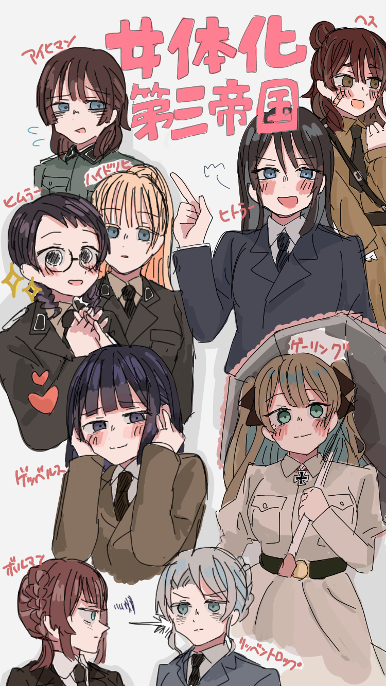 6+girls adolf_hitler bags_under_eyes bandaid bandaid_on_face belt black_belt black_hair black_necktie blonde_hair blue_eyes blue_hair blue_jacket blush braid breast_pocket brown_jacket brown_necktie brown_shirt character_name collared_jacket collared_shirt colored_eyelashes commentary_request cross from_side genderswap genderswap_(mtf) glasses green_eyes green_jacket grey_umbrella hair_bun hands_on_own_head heart heinrich_luitpold_himmler hermann_wilhelm_goering highres index_finger_raised iron_cross jacket joachim_von_ribbentrop joseph_goebbels komati_xmbtx lapels long_hair long_sleeves looking_at_another looking_at_viewer looking_to_the_side martin_ludwig_bormann medal medium_hair military_jacket military_uniform multiple_girls nazi necktie notched_lapels open_mouth otto_adolf_eichmann pocket pointing pointing_to_the_side politician purple_eyes real_life real_life_insert reinhard_tristan_eugen_heydrich round_eyewear rudolf_hess sam_browne_belt shirt single_hair_bun sketch sturmabteilung translated twin_braids twintails umbrella waffen-ss white_background white_shirt