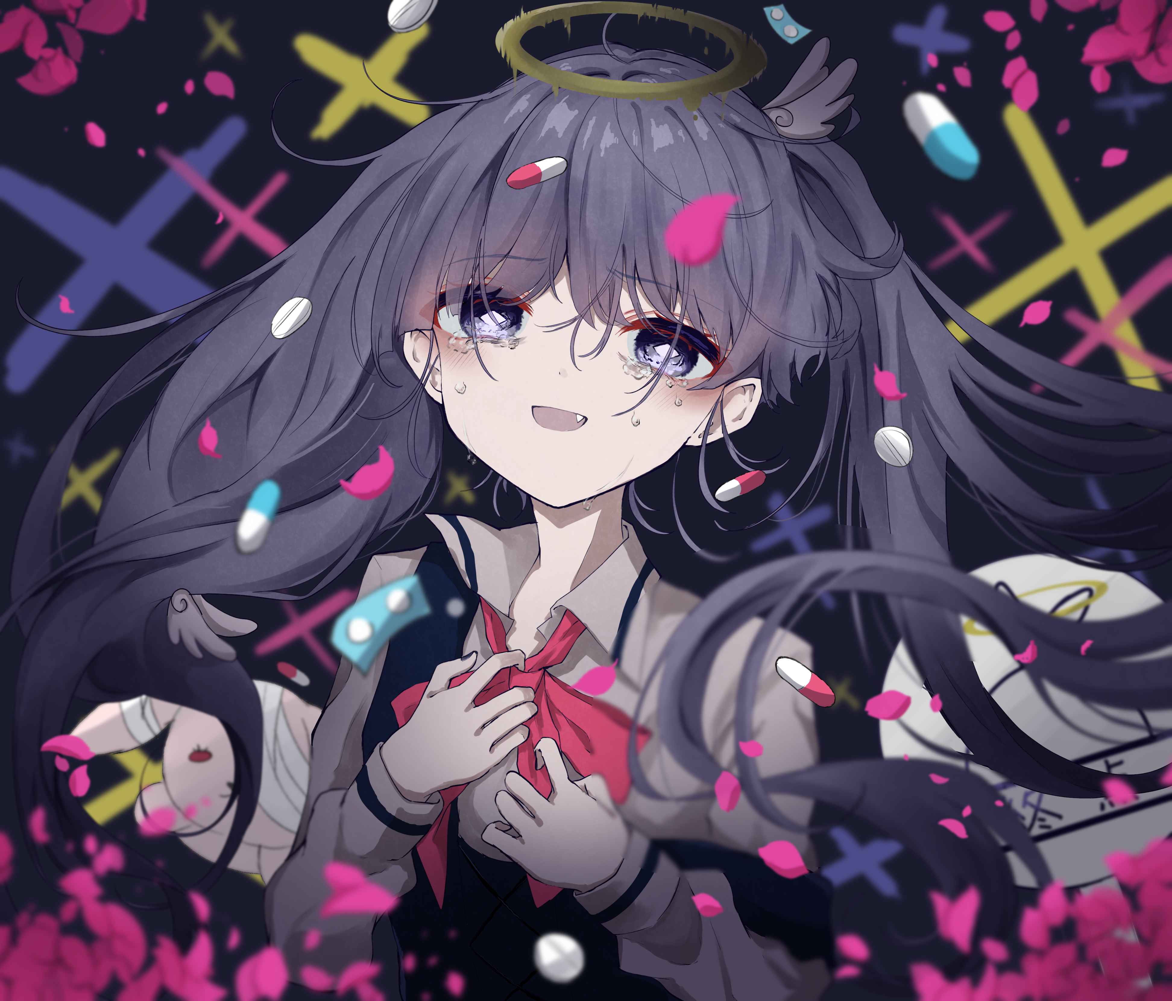 1girl absurdres black_background bus_stop_sign collared_shirt commentary crying crying_with_eyes_open diamond-shaped_pupils diamond_(shape) dot_nose dress falling_petals fang floating_hair floating_headgear grey_shirt hair_ornament hair_tuft halo hands_on_own_chest hands_up headgear highres jirai_kei kayon_(touzoku) long_sleeves looking_at_viewer neck_ribbon open_mouth petals pill pinafore_dress pink_petals purple_background purple_theme red_ribbon ribbon sad shirt shuuten_no_saki_ga_aru_to_suru_naraba_(tuyu) single_off_shoulder sleeveless sleeveless_dress solo strap_slip stuffed_animal stuffed_rabbit stuffed_toy symbol-shaped_pupils tears tuyu_(band) twintails unkempt wing_hair_ornament wings x_(symbol) yellow_halo