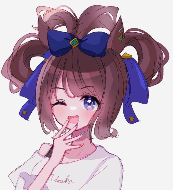 1girl alternate_costume animal_ears blue_bow blue_eyes blush bow brown_hair collarbone ear_piercing hair_between_eyes hair_bow hair_ribbon hand_on_own_face horse_ears horse_girl jewelry looking_at_viewer one_eye_closed open_mouth piercing ribbon shirt short_sleeves simple_background smile solo tosen_jordan_(umamusume) tyamu_mu umamusume upper_body white_background white_shirt