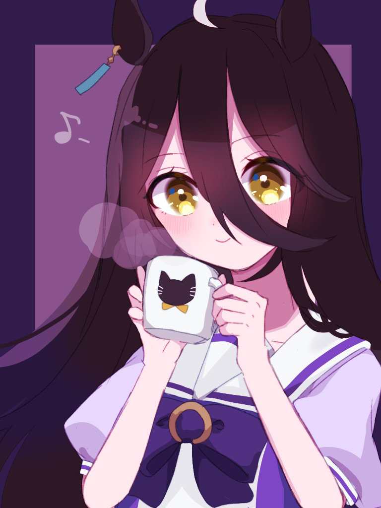 1girl ahoge animal_ears black_hair bow bowtie closed_mouth coffee_mug cup earrings hair_between_eyes holding holding_cup horse_ears horse_girl jewelry long_hair looking_at_viewer manhattan_cafe_(umamusume) mug multicolored_hair puffy_short_sleeves puffy_sleeves purple_bow purple_bowtie purple_shirt sailor_collar sailor_shirt school_uniform shirt short_sleeves simple_background smile solo summer_uniform tracen_school_uniform tyamu_mu umamusume upper_body yellow_eyes