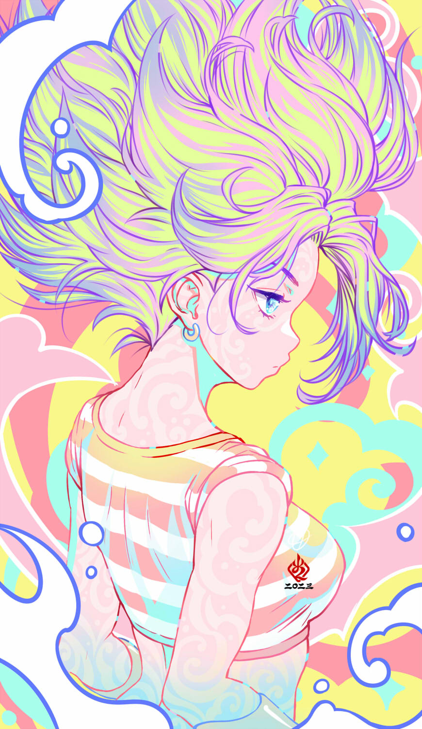 1girl blonde_hair blue_eyes breasts closed_mouth crop_top dragon_ball dragon_ball_super earrings floating_hair from_side highres jewelry kale_(dragon_ball) kanchiyo long_hair medium_breasts profile shirt solo striped_clothes striped_shirt upper_body