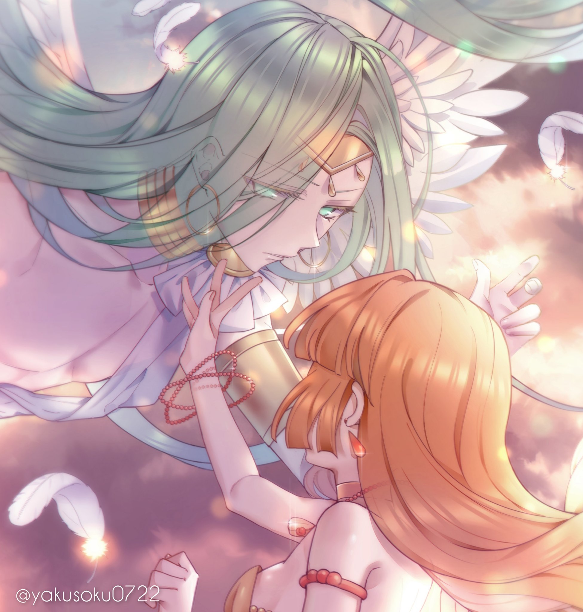+1_(yakusoku0722) 1boy 1girl angel angel_wings bikini bracelet choker closed_mouth cloud earrings eyebrows eyebrows_hidden_by_hair eyelashes feathers green_eyes green_hair hair_between_eyes hair_over_one_eye highres jewelry looking_at_another mermaid mermaid_melody_pichi_pichi_pitch mikeru_(mermaid_melody_pichi_pichi_pitch) monster_girl necklace orange_choker orange_hair seira_(mermaid_melody_pichi_pichi_pitch) shell shell_bikini signature sunlight wings