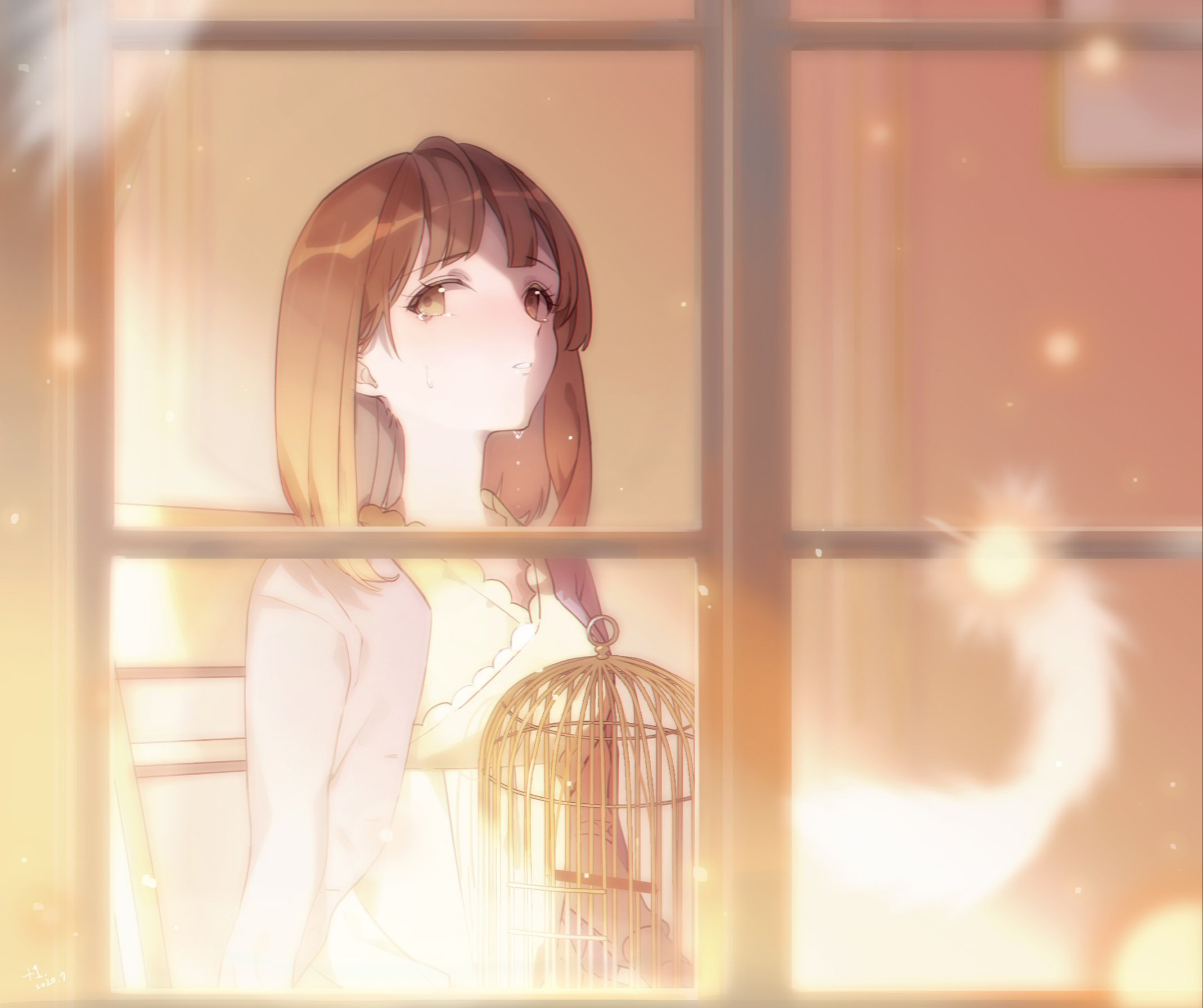 +1_(yakusoku0722) 1girl birdcage blurry blurry_background brown_eyes brown_hair cage chair crying crying_with_eyes_open dress eyebrows eyebrows_hidden_by_hair eyelashes feathers highres jacket mermaid_melody_pichi_pichi_pitch mikaru_(mermaid_melody_pichi_pichi_pitch) picture_frame purple_jacket sitting sunlight tears window