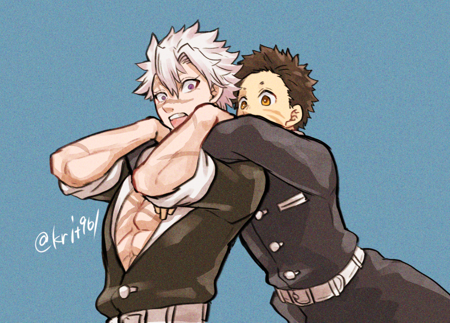 2boys bare_pectorals belt blue_background brown_eyes brown_hair facial_scar hug hug_from_behind kimetsu_no_yaiba krit kumeno_masachika long_sleeves looking_at_viewer male_focus multiple_boys open_mouth pectorals purple_eyes scar scar_on_cheek scar_on_chest scar_on_face shinazugawa_sanemi short_hair sleeves_rolled_up teeth twitter_username upper_teeth_only white_belt white_hair yaoi
