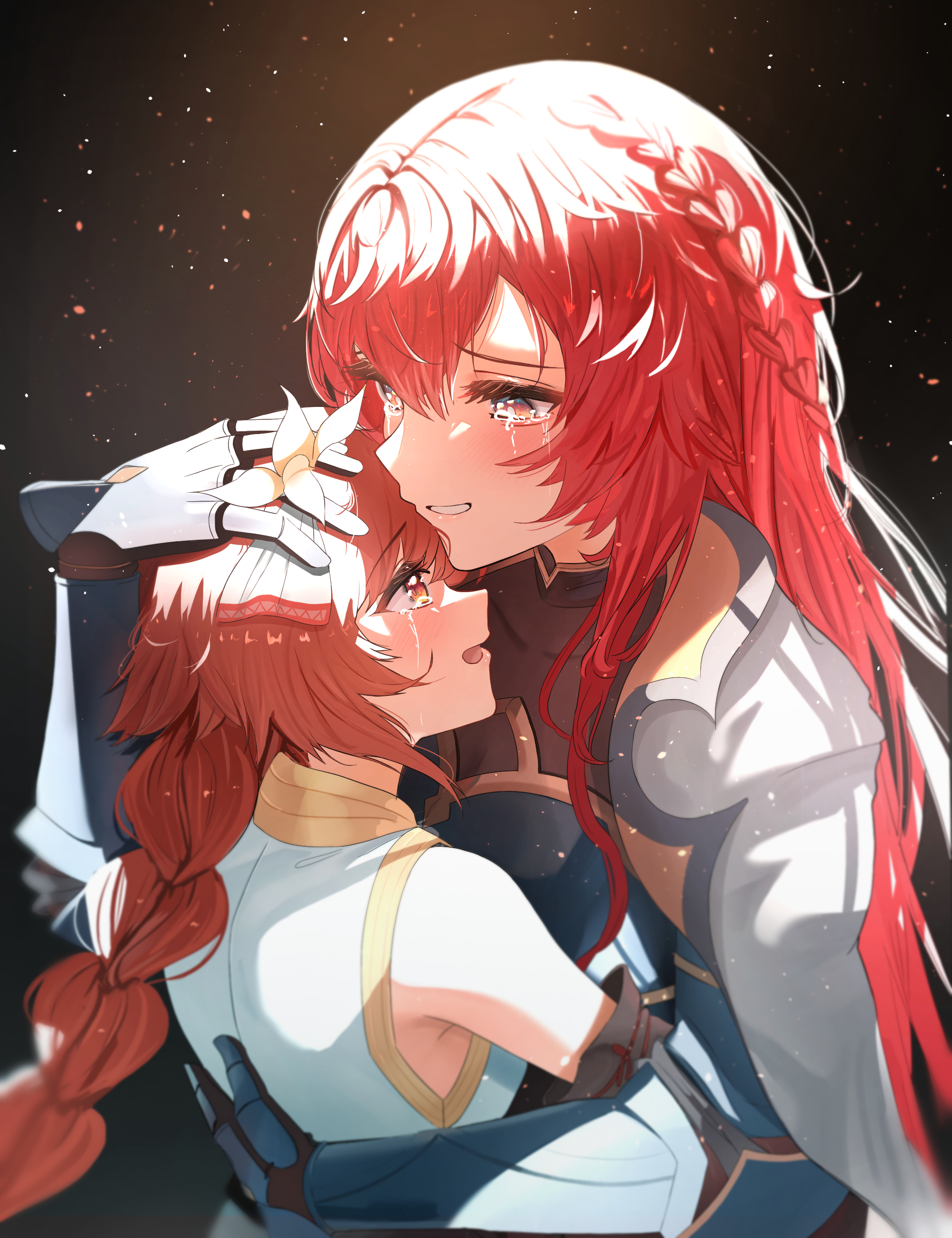 2girls absurdres arm_armor armor bodysuit braid breastplate cape cloak fenie_(granblue_fantasy) flower flower_ornament granblue_fantasy headband headpat highres hug long_bangs long_braid menipa_(menipapapa) mother_and_child mother_and_daughter multiple_girls orange_hair parent_and_child red_hair sabrina_(granblue_fantasy) side_braid tears yellow_flower