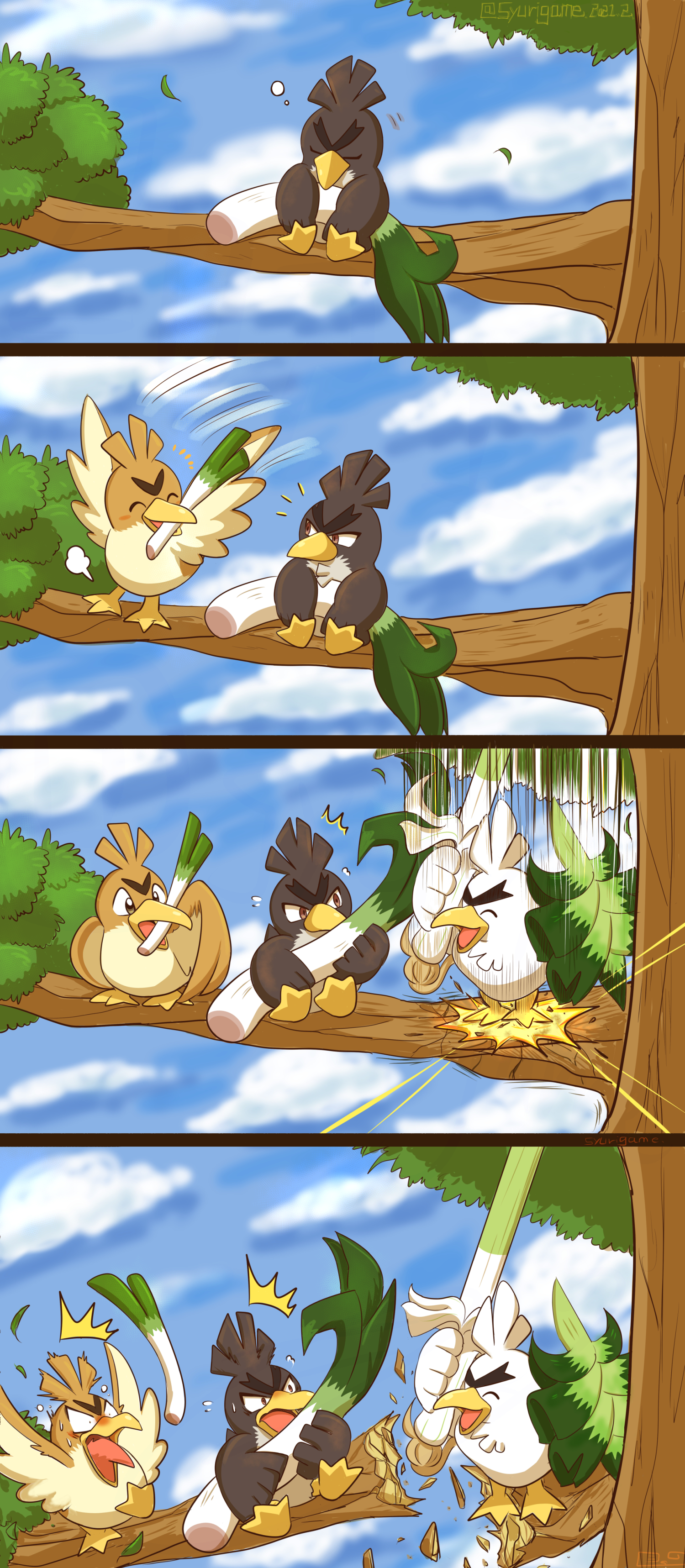 absurdres bird blue_sky breaking brown_eyes closed_eyes cloud duck farfetch'd food galarian_farfetch'd galarian_form gen_1_pokemon gen_8_pokemon heavy highres holding holding_food holding_vegetable in_tree mouth_hold nintendo no_humans pokemon pokemon_(creature) puff_of_air scared shuri_(syurigame) sirfetch'd sitting_on_branch sky spring_onion tree v-shaped_eyebrows vegetable