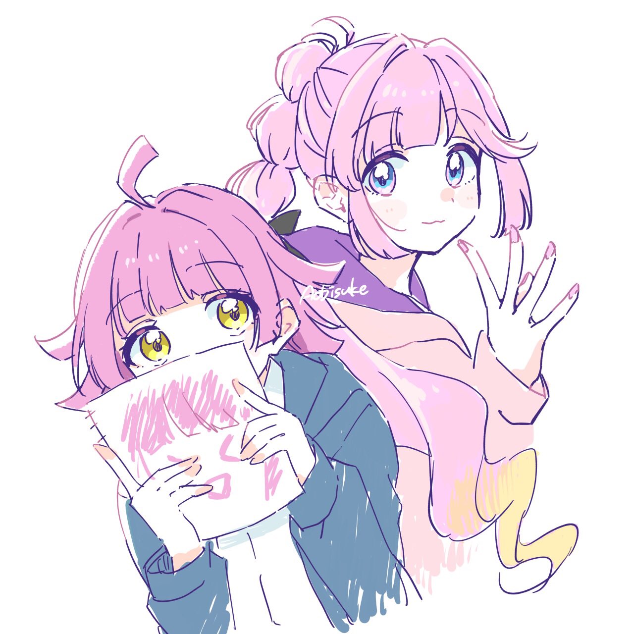 >_< 2girls :d ahoge anyoji_hime aobisuke artist_name black_ribbon blonde_hair blue_eyes blue_jacket blunt_bangs blunt_ends collared_shirt commentary covering_own_mouth crossover drawing_(object) dress_shirt gradient_hair hair_ribbon hand_up highres holding holding_paper hood hooded_jacket in-franchise_crossover jacket link!_like!_love_live! long_hair looking_at_viewer love_live! love_live!_nijigasaki_high_school_idol_club medium_hair multi-tied_hair multicolored_hair multiple_girls nijigasaki_school_uniform open_mouth paper pink_hair pink_jacket ponytail ribbon rina-chan_board school_uniform shirt sidelocks signature simple_background smile swept_bangs tennoji_rina trait_connection upper_body very_long_hair virtual_youtuber white_background white_shirt winter_uniform xd yellow_eyes
