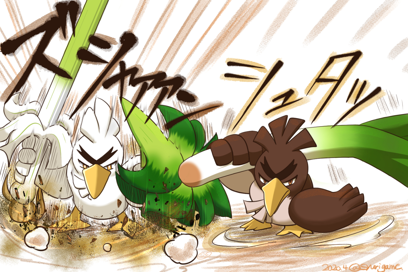 bird brown_eyes closed_mouth dated debris dust evolutionary_line fighting_stance food full_body galarian_farfetch'd galarian_form gen_8_pokemon holding holding_food holding_vegetable nintendo no_humans pokemon pokemon_(creature) shuri_(syurigame) signature sirfetch'd standing thick_eyebrows translation_request v-shaped_eyebrows vegetable white_background