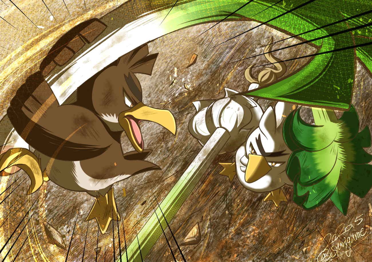 bird brown_eyes dated debris dirty duck duel evolutionary_line fighting food galarian_farfetch'd galarian_form gen_8_pokemon holding holding_food holding_vegetable motion_lines nintendo no_humans open_mouth outdoors pokemon pokemon_(creature) shuri_(syurigame) signature sirfetch'd solo thick_eyebrows v-shaped_eyebrows vegetable