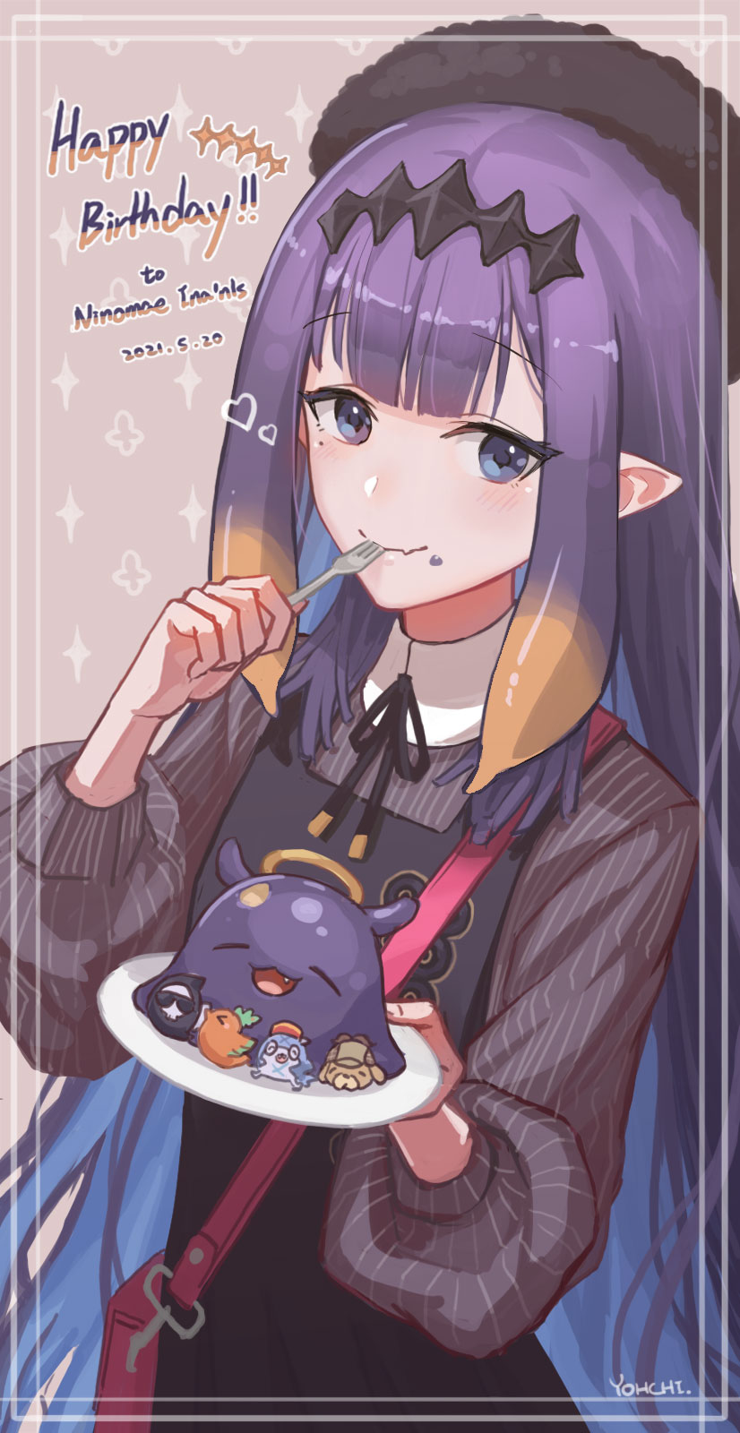 1girl artist_name bag beret black_dress black_hat black_ribbon bloop_(gawr_gura) blue_eyes bubba_(watson_amelia) closed_mouth commentary death-sensei_(mori_calliope) dress english_commentary fork hair_ornament handbag happy_birthday hat heart highres holding holding_fork holding_plate hololive hololive_english kotori_(takanashi_kiara) light_blush long_sleeves looking_at_viewer mole mole_under_eye neck_ribbon ninomae_ina'nis ninomae_ina'nis_(casual) official_alternate_costume orange_hair pinafore_dress pink_bag pinstripe_pattern pinstripe_shirt plate pointy_ears puffy_sleeves purple_hair ribbon shirt sidelocks sleeveless sleeveless_dress solo standing striped_clothes striped_shirt takodachi_(ninomae_ina'nis) tentacle_hair upper_body vertical-striped_clothes vertical-striped_shirt virtual_youtuber yohchi