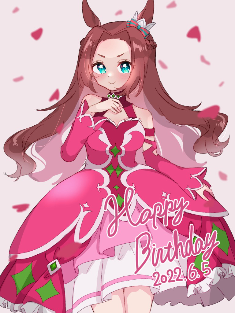 1girl animal_ears bare_shoulders blue_eyes blush bow braid breasts brown_hair closed_mouth detached_sleeves dress ear_ornament falling_petals gloves hair_intakes happy_birthday horse_ears horse_girl horse_tail kawakami_princess_(princess_of_pink)_(umamusume) kawakami_princess_(umamusume) long_hair looking_at_viewer medium_breasts petals pink_petals smile solo tail tyamu_mu umamusume