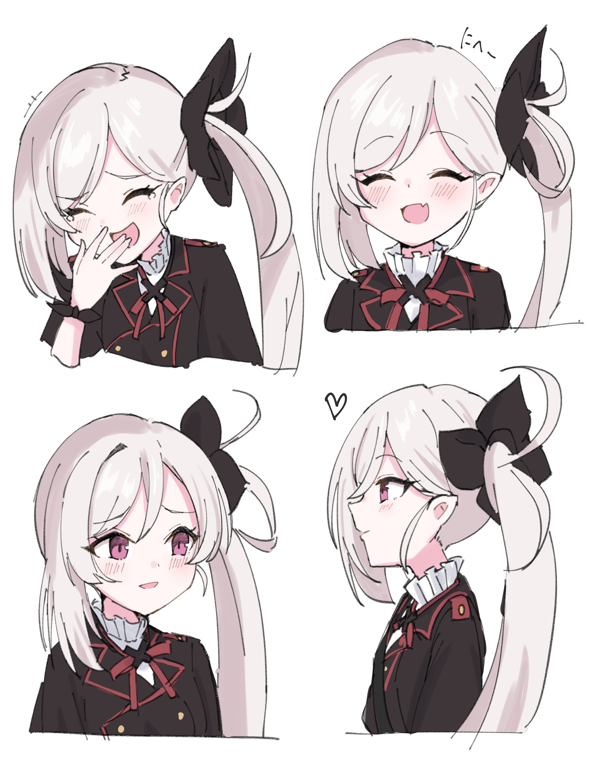 1girl :d \||/ absurdres black_jacket blue_archive blush closed_eyes cropped_torso fang grey_hair heart highres jacket kaito_(kaito921125) laughing long_hair multiple_views mutsuki_(blue_archive) open_mouth pink_eyes pointy_ears side_ponytail skin_fang smile tearing_up white_background