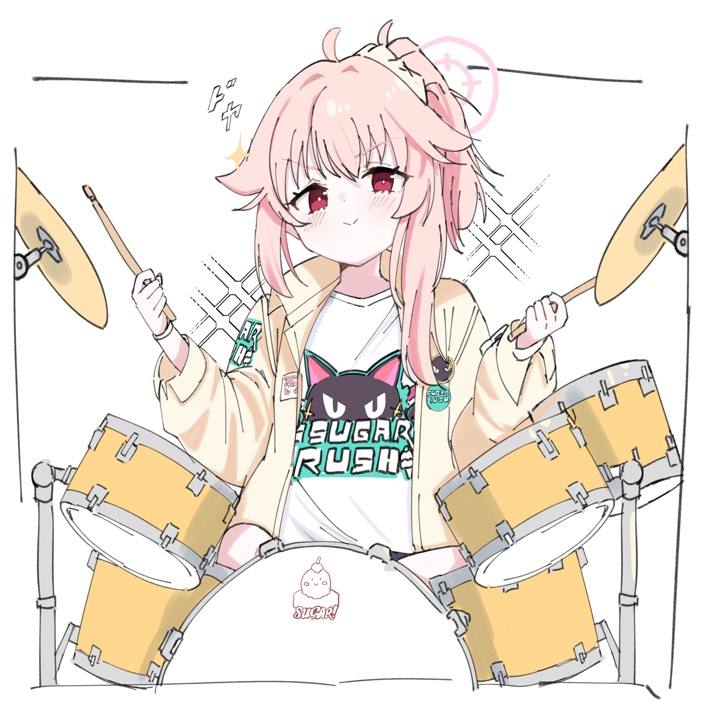 1girl :> absurdres ahoge blue_archive blush bright_pupils brown_jacket closed_mouth clothes_writing drum drum_set drumsticks hair_ears hair_ornament hair_scrunchie highres holding holding_drumsticks instrument jacket kaito_(kaito921125) long_hair long_sleeves looking_at_viewer natsu_(band)_(blue_archive) natsu_(blue_archive) official_alternate_costume pink_hair ponytail red_eyes scrunchie shirt sitting solo sparkle sparkling_aura v-shaped_eyebrows white_background white_shirt