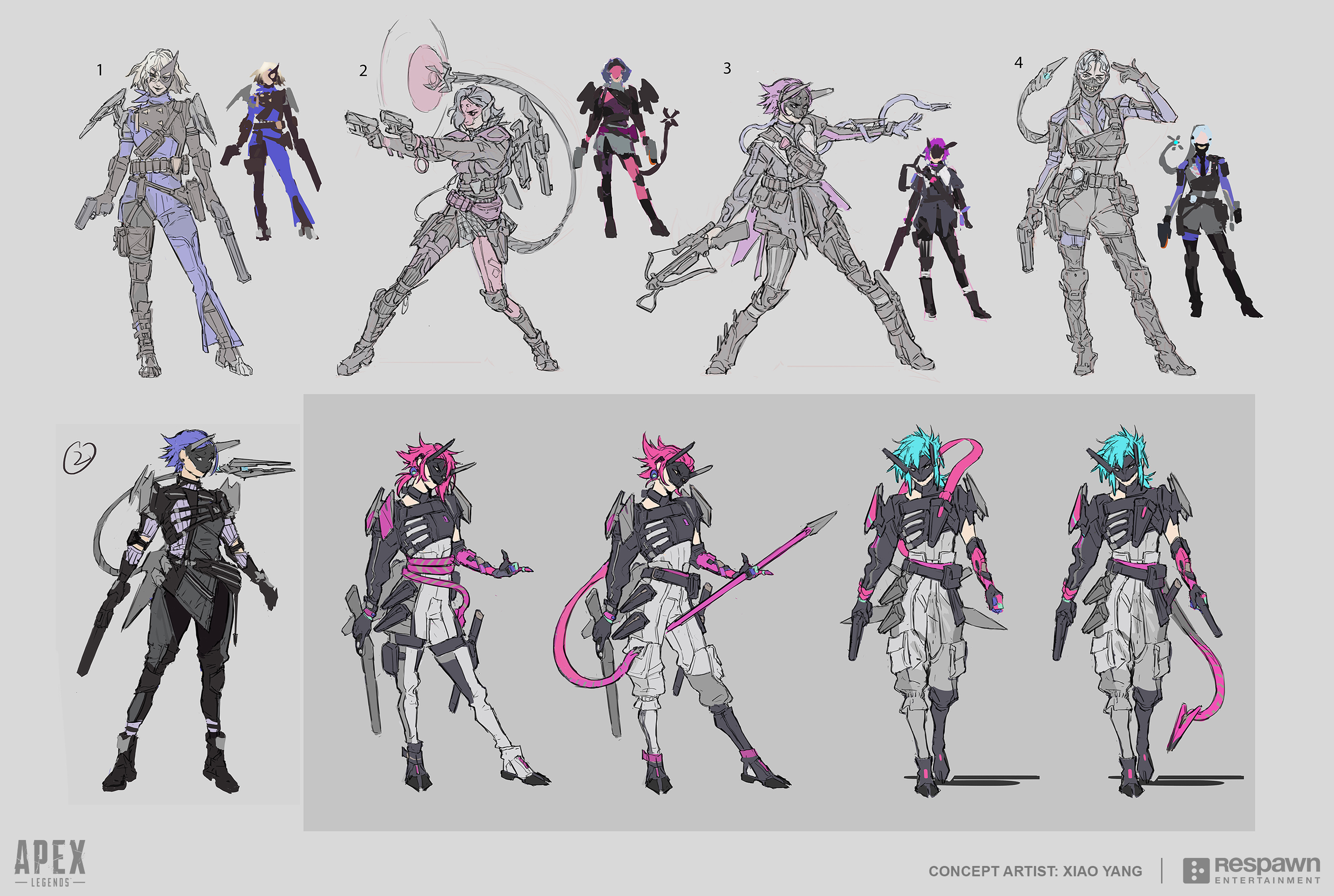 1girl alter_(apex_legends) apex_legends black_gloves blue_bodysuit bodysuit bow_(weapon) commentary concept_art copyright_name crossbow dual_wielding english_commentary finger_gun finger_gun_to_head gloves grey_bodysuit grey_hair grey_pants gun head_tilt highres holding holding_crossbow holding_gun holding_polearm holding_weapon logo mechanical_tentacles multiple_views official_art pants pink_hair polearm production_art prototype_design purple_hair respawn_entertainment sketch spear walking weapon yang_niangniang