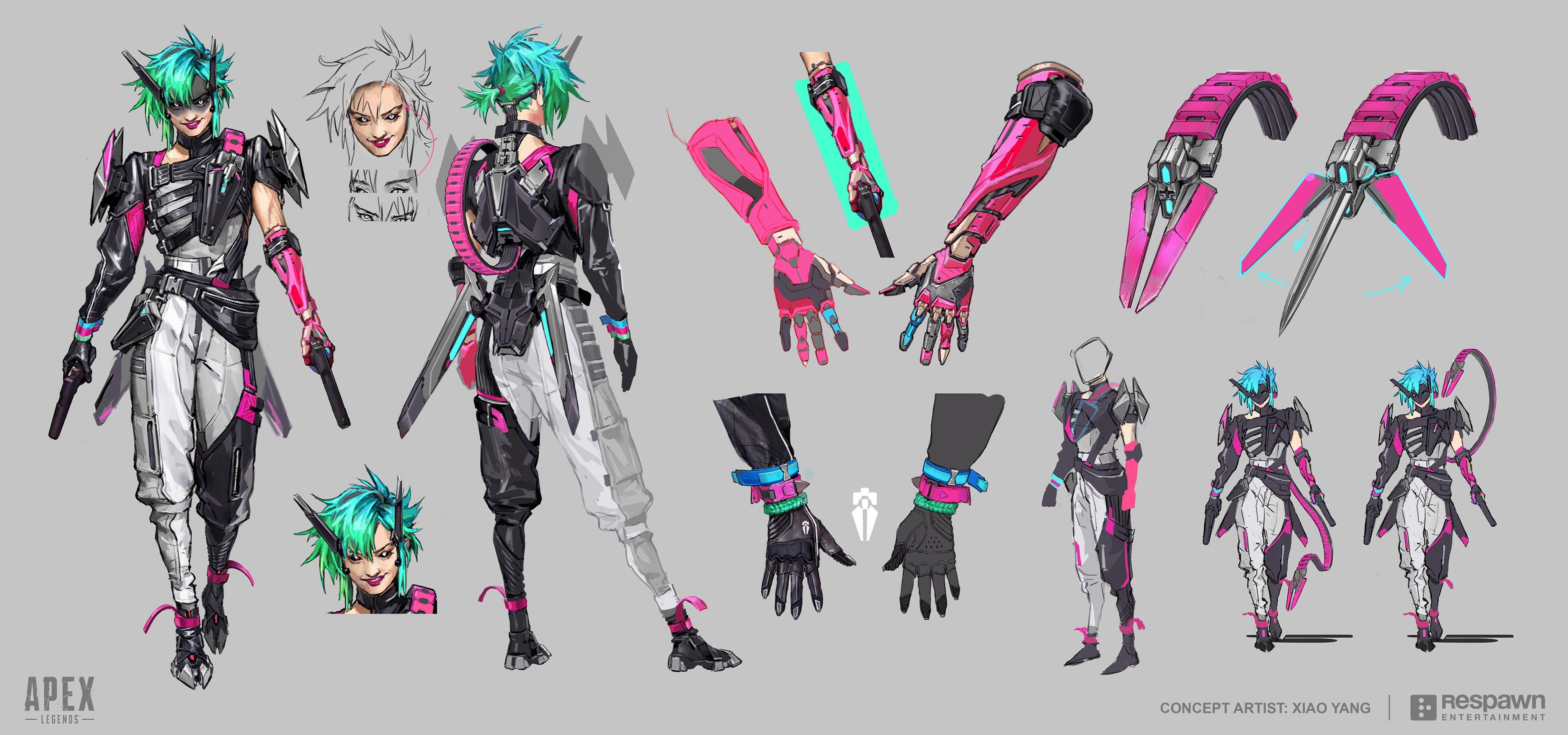1girl absurdres alter_(apex_legends) apex_legends arrow_(symbol) artist_name black_footwear black_gloves black_sclera blue_hair colored_sclera commentary concept_art copyright_name english_commentary gloves green_hair grey_background grey_pants head_tilt highres horns logo looking_at_viewer mechanical_arms mechanical_horns mechanical_tentacles multicolored_hair multiple_views official_art pants parted_lips ponytail production_art respawn_entertainment short_hair single_mechanical_arm smile third-party_source two-tone_hair walking white_eyes yang_niangniang