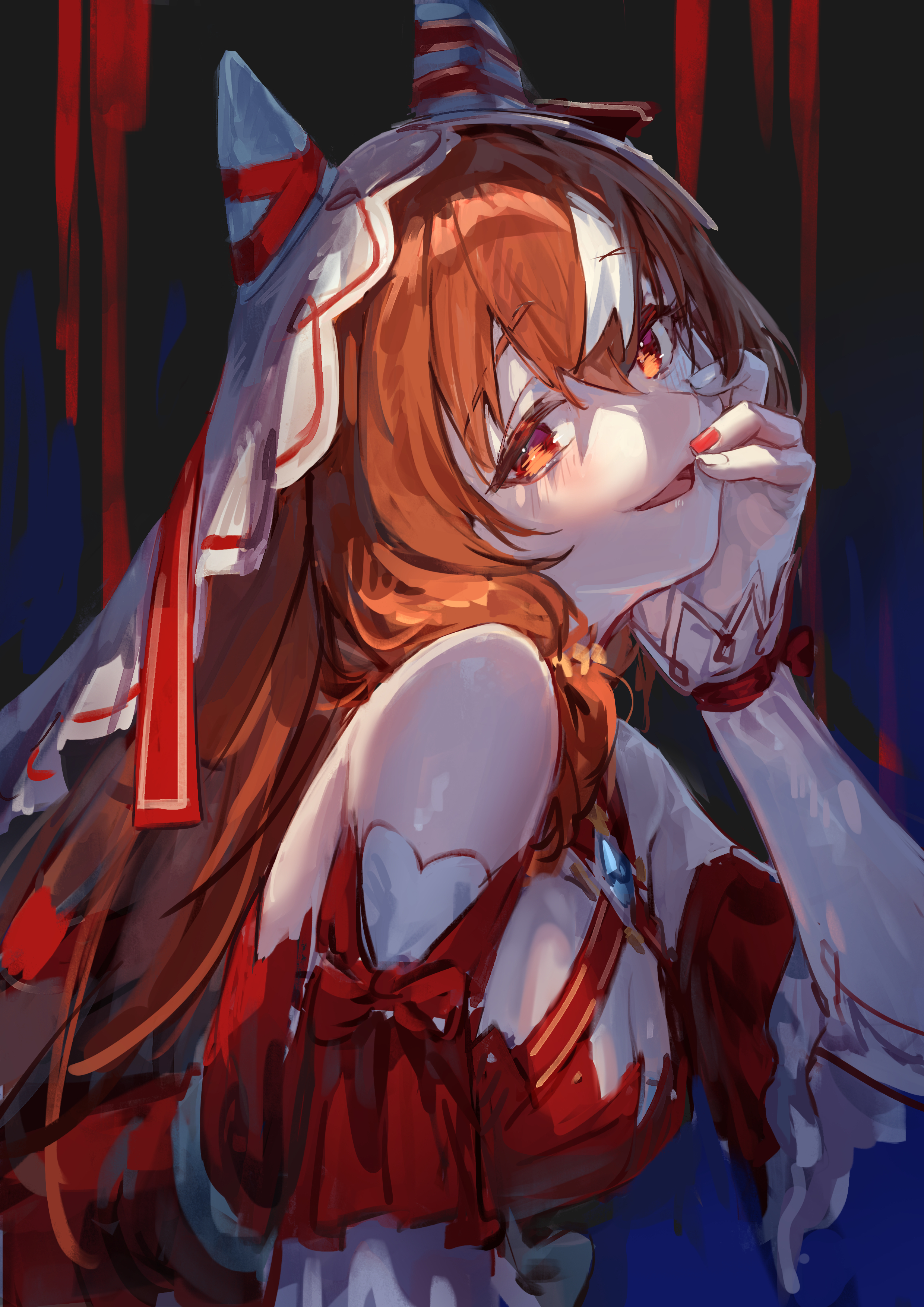 1girl absurdres animal_ears breasts brown_hair closed_mouth collarbone commentary_request dark_background detached_sleeves fingernails hair_ornament hand_on_own_cheek hand_on_own_face highres horse_ears horse_girl long_hair looking_at_viewer medium_breasts portrait red_eyes still_in_love_(scarlet_vow_raiment)_(umamusume) still_in_love_(umamusume) umamusume veil yu_hydra
