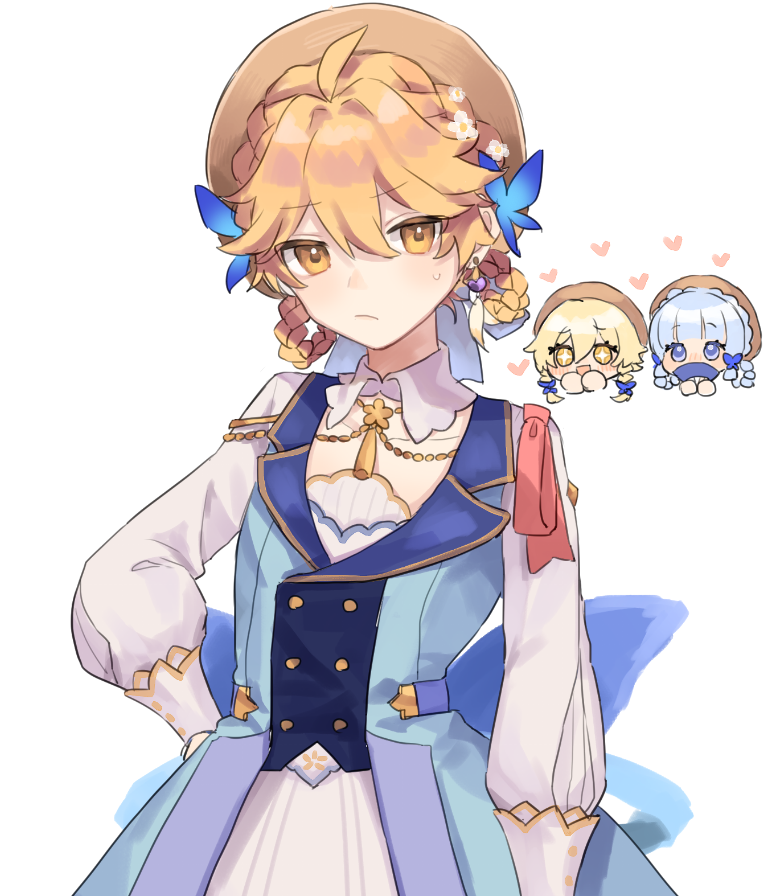 +_+ 1boy 2girls aether_(genshin_impact) alternate_hairstyle ayaka_(genshin_impact) back_bow blonde_hair blue_bow blue_dress blue_eyes blue_hair blush bow braid brother_and_sister brown_hat butterfly_hair_ornament buttons closed_mouth collarbone commentary_request cosplay covered_mouth crossdressing crown_braid detached_collar dress earrings floral_print flower flower_necklace genshin_impact gold_necklace hair_between_eyes hair_flower hair_ornament hand_fan hand_on_own_hip hands_up hat heart holding holding_fan jewelry kamisato_ayaka kamisato_ayaka_(springbloom_missive) lapels long_sleeves looking_at_another looking_at_viewer lumine_(genshin_impact) multiple_girls necklace neraku0403 official_alternate_costume official_alternate_hairstyle open_mouth pink_bow puffy_long_sleeves puffy_sleeves short_hair siblings simple_background single_earring smile standing sweatdrop twin_braids two-tone_dress v-shaped_eyebrows white_background white_dress white_flower wing_collar yellow_eyes