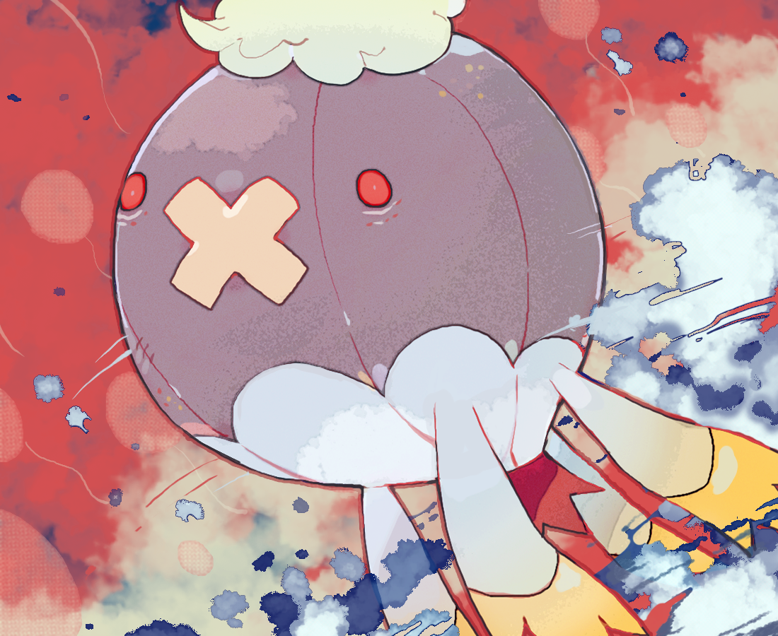 above_clouds akadako animal_focus bags_under_eyes balloon cloud drifblim dutch_angle floating full_body gen_4_pokemon nintendo no_humans one-hour_drawing_challenge outdoors outline pokemon pokemon_(creature) red_eyes red_outline red_sky sky solo